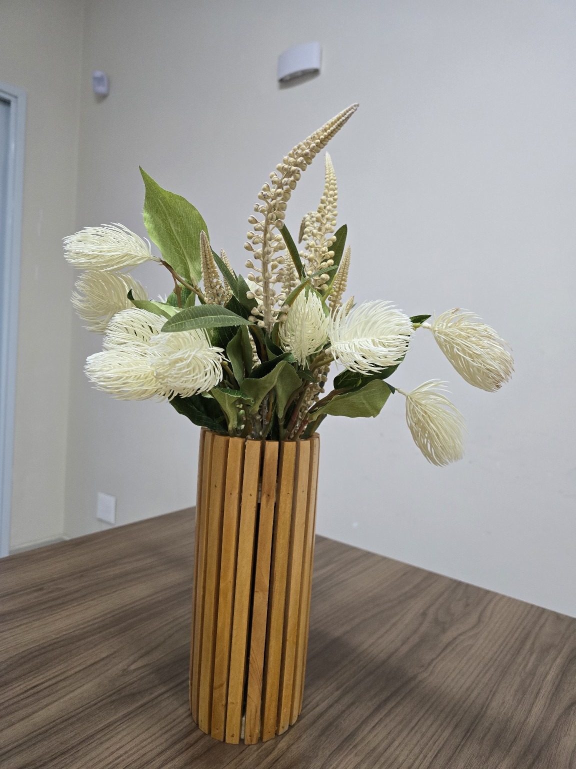 Seu design ripado confere um visual moderno e artesanal ao mesmo tempo, ideal para composições com plantas secas, artificiais ou até mesmo como peça decorativa por si só.